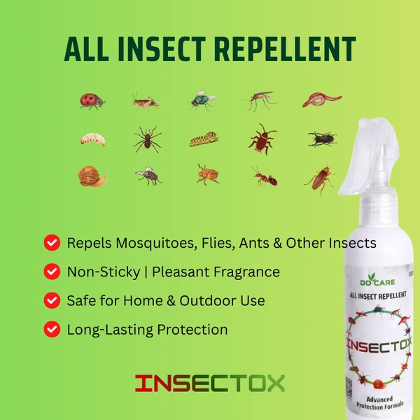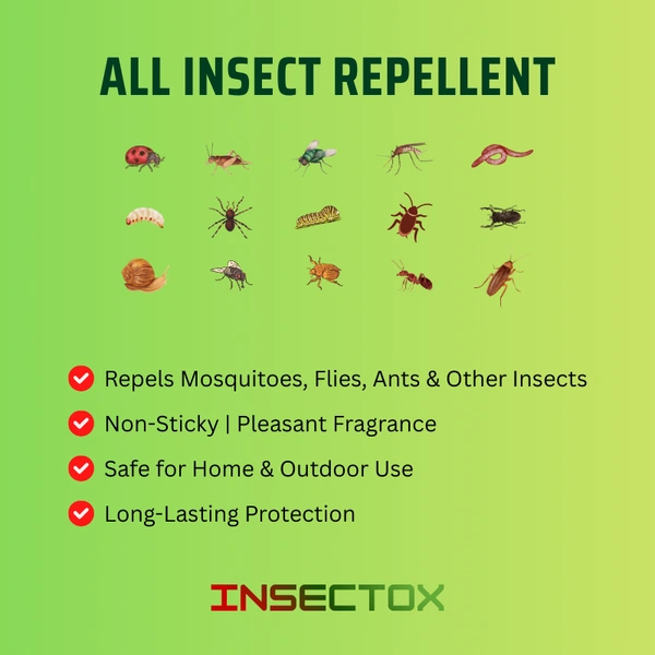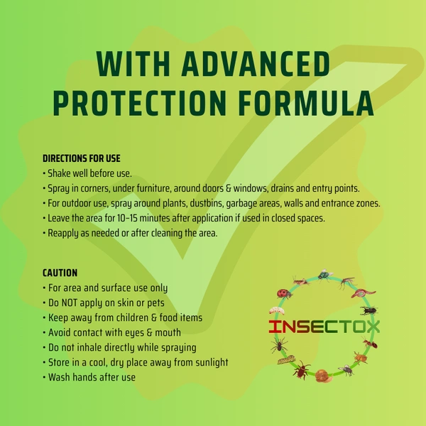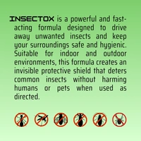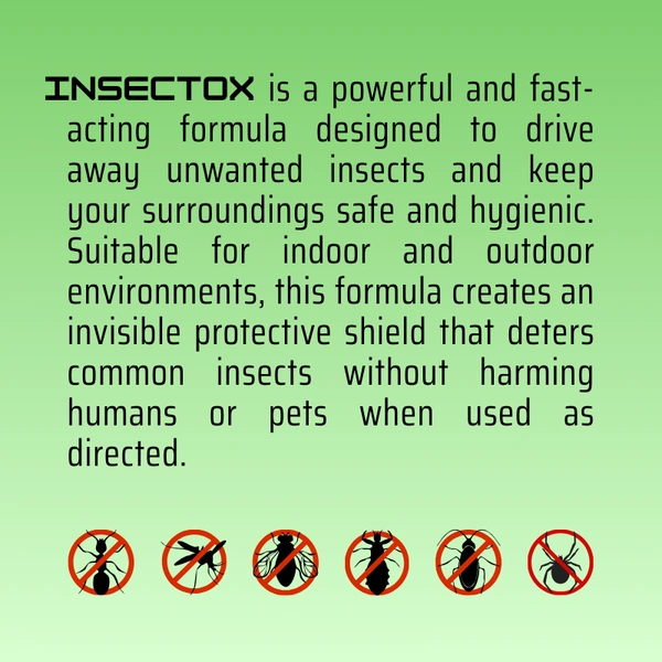 INSECTOX is a powerful and fast-acting formula designed to drive away unwanted insects and keep your surroundings safe and hygienic. Suitable for indoor and outdoor environments, this formula creates an invisible protective shield that deters common insects without harming humans or pets when used as directed.