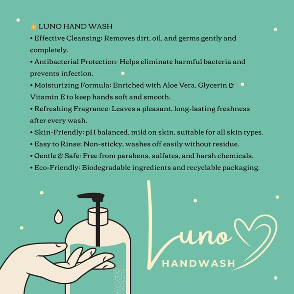 Luno hand wash Gel is Refreshing Liquid hand wash, It kills the germs and gives the pleasant fresh fragrance of Lemon that gives you a long lasting freshness.